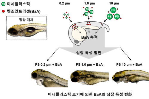 연구팀은 0.2, 1.0, 10㎛(마이크로미터)의 미세플라스틱과 BaA를 제브라피시에 노출한 결과, 미세플라스틱의 입자 크기가 작을수록 심장 기형 등 BaA의 독성 영향이 커지는 것을 확인했다.