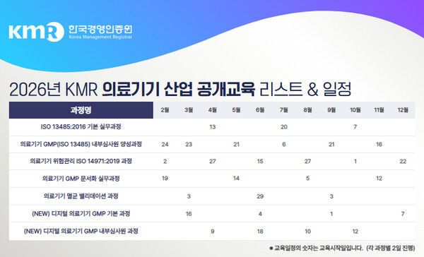 [mdtoday=박성하 기자] 한국경영인증원(KMR) 교육사업센터는 국내 의료기기 기업의 글로벌 경쟁력 강화를 위해 ‘2026년도 의료기기 전문 인력 양성 교육’ 연간 일정을 확정하고 수강생 모집을 시작한다고 밝혔다.