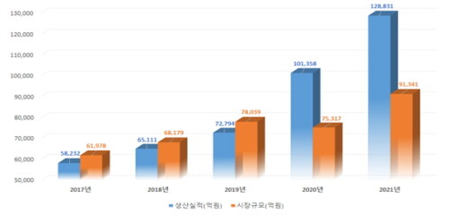 | ▲ 연도별 의료기기 생산실적 및 시장규모 (그래프=식품의약품안전처 제공) |