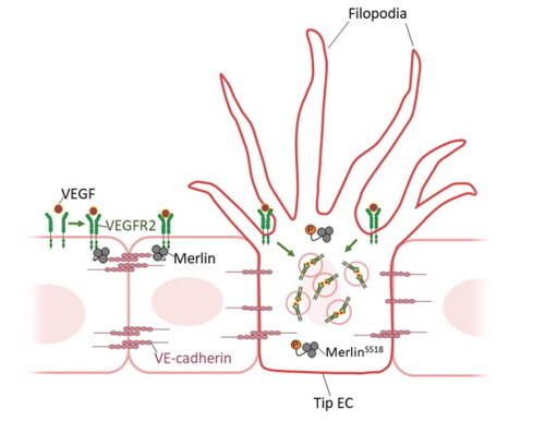 이를 통해 Merlin이 세포막에 있는 VEGF 수용체와 결합해 VEGF 수용체의 세포 내 이동에 따른 첨단세포 활성화를 억제하는 것을 밝혔으며, 더 나아가 Merlin이 혈관신생 과정에서 VE-Cadherin 밀도의 높고 낮음에 따라 VEGF 수용체의 세포 내 이동을 조절하는 수문장(Gatekeeper) 역할을 함으로써 특정 혈관내피세포가 첨단세포로 분화 유도되는 기작을 규명했다.