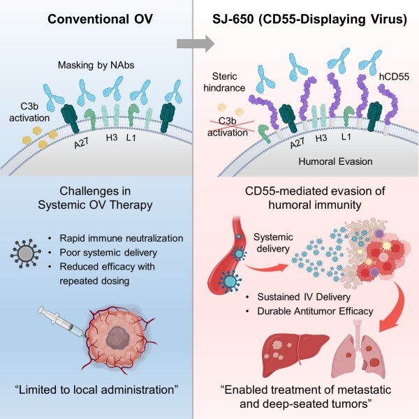 기존 항암 바이러스 치료제는 종양 내 직접 주사 방식에 의존해야 하는 한계가 있었다. 정맥 투여 시 체내 면역 체계인 보체와 중화항체에 의해 바이러스가 종양에 도달하기 전 제거되는 경우가 많았기 때문이다. 신라젠은 SJ-650의 바이러스 표면에 보체 조절 단백질인 ‘CD55’를 발현시켜 이러한 면역 체계를 회피하도록 설계했다.