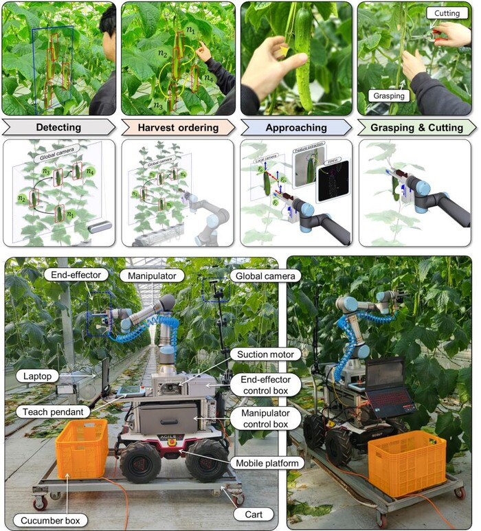 연구팀이 개발한 과채류 수확용 로봇은 이러한 인간 작업자가 수확할 때 보이는 행동들을 차례로 인식(perception), 수확 순서 최적화(harvesting ordering), 영상 기반 추적제어(visual servoing), 그리퍼(gripper)로 치환해 작물수확을 보조한다.
