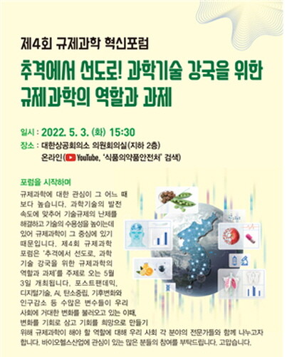 식품의약품안전처는 ‘추격에서 선도로! 과학기술 강국을 위한 규제과학의 역할과 과제’를 주제로 3일 대한상공회의소에서 한국에프디시규제과학회와 함께 ‘제4회 규제과학 혁신포럼’을 개최한다고 밝혔다.