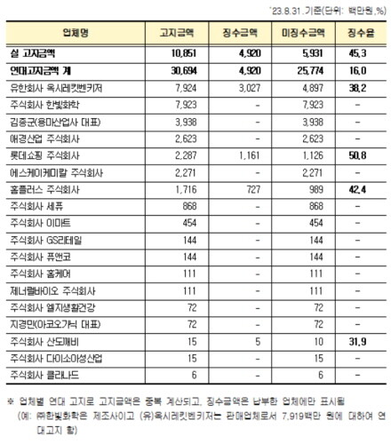 하지만 현재까지 징수실적은 49억 2000만원으로 징수율이 45.3%으로 드러났으며, 징수금액을 일부라도 납부한 업체는 18개 중 4곳에 불과했다.