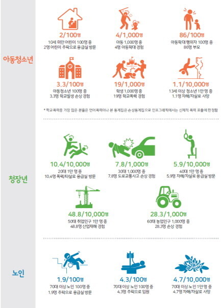 생애주기별로 달라지는 활동과 환경에 따라 발생하는 손상의 양상도 다르게 나타났다. 아동·청소년기에는 아동 1000명 중 4명이 아동학대를 경험했으며, 아동학대 행위자는 100명 중 86명이 부모였다.