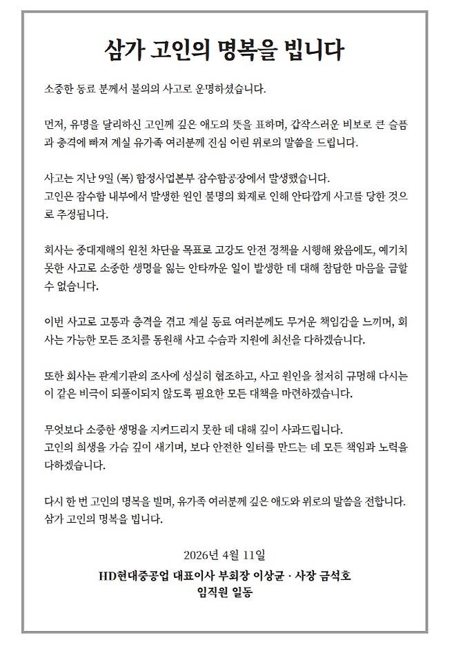 [mdtoday = 유정민 기자] HD현대중공업이 울산조선소에서 발생한 근로자 사망 사고로 인해 안전 관리 체계 전반이 도마 위에 올랐다. 지난 9일 정비 중이던 홍범도함(잠수함)에서 화재가 발생해 내부 작업자 1명이 숨지는 사고가 발생하자, 노동조합은 사측의 안전불감증과 관리 부실이 초래한 인재라고 강하게 규탄했다.