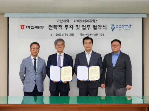 | ▲ 아산제약-파미르테라퓨틱스 전략적 투자 및 업무 협약식(사진=파미르테라퓨틱스 제공) |