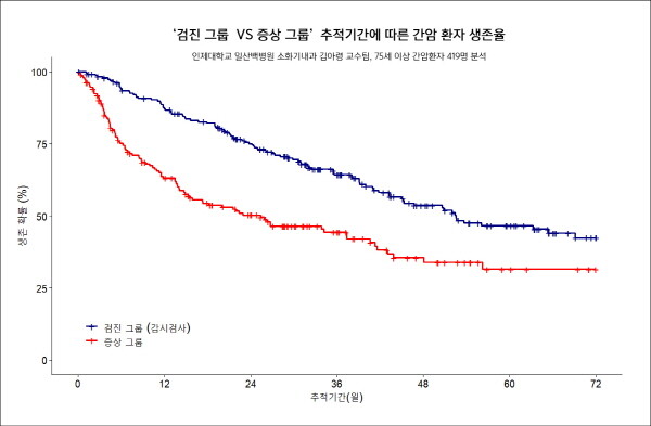 | ▲ 검진그룹과 증상그룹간 간암 환자 생존율 비교 (사진=인제대 일산백병원 제공) |