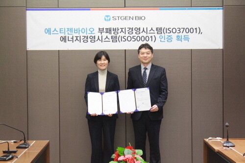 [mdtoday=김준수 기자] 에스티젠바이오가 지난 21일 BSI(British Standards Institution, 영국왕립표준협회)로부터 국제표준인 부패방지경영시스템 ISO37001과 에너지경영시스템인 ISO50001인증을 획득했다고 22일 밝혔다.