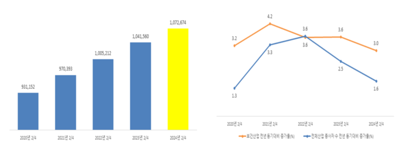 | ▲ 2024년 2/4분기 보건산업 종사자 수 및 전년 동기대비 증가율 (사진=한국보건산업진흥원 제공) |
