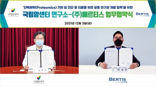 [mdtoday=남연희 기자] 베르티스는 국립암센터 연구소와 ‘프로테오믹스 기반 암 진단 및 치료를 위한 공동 연구와 개발 협력’을 위해 업무협약(MOU)을 체결했다고 7일 밝혔다.