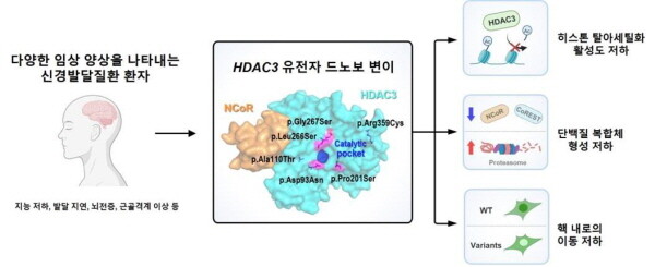 | ▲ 연구팀은 HDAC3 유전자에 발생한 6가지 신생 돌연변이는 히스톤 탈아세틸화 효소의 활성도 저하, 단백질 복합체 형성의 저해, 핵으로의 이동 저하 등과 같은 기능적 결함을 초래하여, 다양한 신경발달질환을 유발할 수 있음을 입증했다. (사진=서울대병원 제공) |