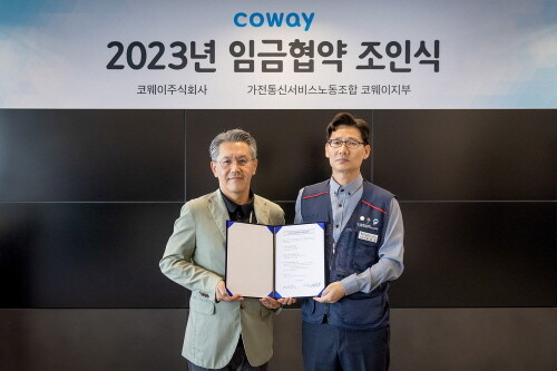이번 ‘2023년 임금협약 조인식’에는 서장원 코웨이 대표이사와 이현철 전국가전통신서비스 노동조합 위원장 등 노사 대표들이 참석한 가운데 노사가 함께 협약서에 서명했다.