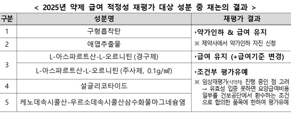 또한 설글리코타이드 등 3개 성분은 식품의약품안전처의 임상 재평가가 진행 중으로, 유효성 입증 여부에 따라 요양급여비용 일부 환수 조건을 달아 평가를 유예하기로 결정됐다.