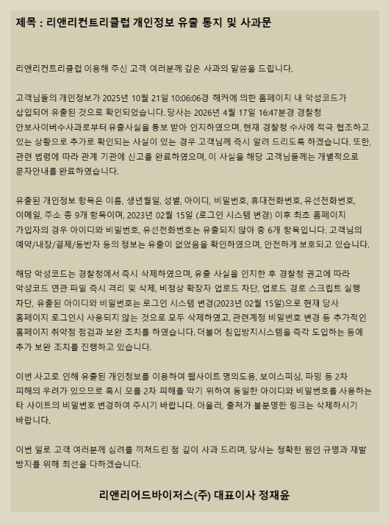 | ▲ 리앤리CC 개인정보 유출 통지 및 사과문 (사진=리앤리CC 홈페이지) |