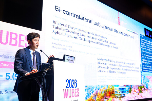 [mdtoday = 박성하 기자] 화홍병원은 지난 4월 4일부터 5일까지 개최된 세계적인 양방향 척추 내시경 학술대회인 ‘WUBES 2026(World Unilateral Biportal Endoscopic Surgery Congress 2026)’에서 홍영호 진료부원장이 지난 5일 연자로 나서 최신 수술 기법을 발표했다고 밝혔다.