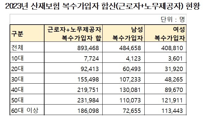 근로자와 노무제공자의 산재보험 복수가입자를 합산할 경우, 2014년 77만3452명이었던 것이 2023년 89만3468명으로 15.5% 늘었다. 2023년 현재 복수가입자가 가장 많은 연령은 50대였고, 남성은 40대, 여성은 50대에서 복수가입자 비중이 가장 높았다. 가구 내 핵심소득원일 가능성이 높은 집단이다.