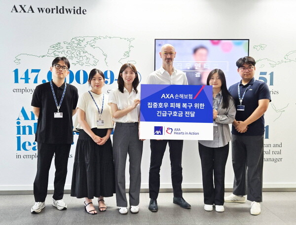 | ▲ AXA손해보험이 집중호우 피해 지역에 긴급 구호금 지원금을 전달하고 기념 사진을 찍고 있다. (사진= AXA손해보험 제공) |