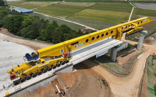 | ▲ 동부건설은 자사가 시공 중인 호남고속철도 2단계(고막원~목포) 2공구 현장에 ‘PSM(Precast Span Method)’ 공법을 적용해 첫 상판 거치를 시작으로 본격적인 교량 시공에 돌입했다. (사진= 동부건설 제공) |