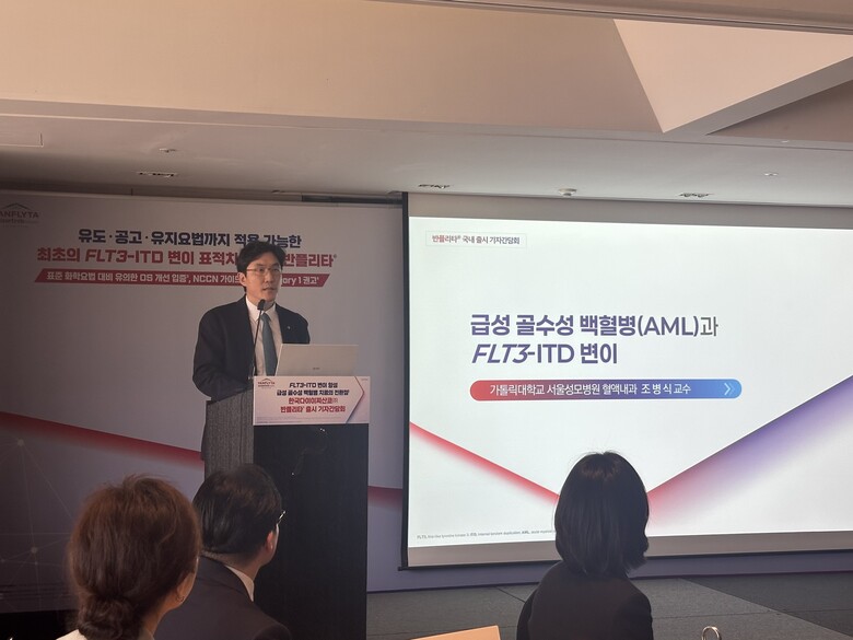 이날 간담회에서는 서울성모병원 혈액내과 조병식 교수와 서울대학교병원 혈액종양내과 신동엽 교수가 연자로 나서 AML과 FLT3-ITD 변이 양성 환자의 치료 부담을 조명하고, QuANTUM-First 연구를 중심으로 새로운 치료 전략으로서 반플리타의 임상적 가치를 공유했다.