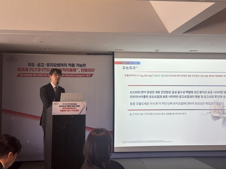 조 교수는 “FLT3 저해제의 등장으로 치료 패러다임이 발전함에도 불구하고, FLT3 변이 양성 AML은 기존 FLT3 저해제와 화학요법 병용 시 2년 누적 재발률이 약 40%에 달하는 것으로 관찰된다”며 “이중에서 다수를 차지하고 예후가 불량한 FLT3-ITD 변이 양성 AML 환자의 예후를 개선할 수 있는 새로운 치료 옵션에 대한 미충족 수요가 높은 상황”이라고 강조했다.
