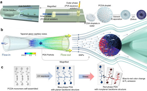 박범준 교수 연구팀은 공류 미세 유체 방법을 이용해 폴리다이아세틸렌(PDA) 입자를 제작했다. 이 입자는 외부 자극을 받으면 색이 변하고 빛을 내는데 연구팀은 이 특성을 이용해 혈관과 비슷한 환경에서 기계적 압력이 어떻게 작용하는지 형광 현미경을 이용해 분석했다. 유체 흐름에 따른 기계적 응력이 입자의 색 변화를 어떻게 일으키는지 측정했고, 그 결과를 정량화했다.