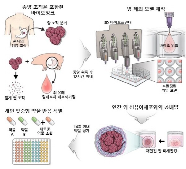 연구팀은 환자의 위암 조직 조각, 위에서 유래한 탈세포화 세포외기질(ECM) 하이드로젤로 바이오잉크를 만들어 암세포와 주변 조직(간질세포) 사이의 상호작용을 재현했다. 또, 여기에 위 섬유아세포를 함께 배양해 종양을 둘러싼 미세환경을 더욱 정교하게 구현했다.