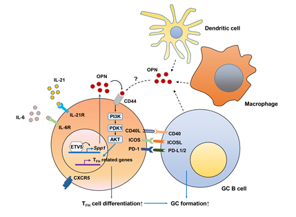 이를 통해 연구팀은 ETV5가 타겟 단백질인 오스테오폰틴(OPN) 발현을 촉진하고, OPN이 T세포 특정 단백질(CD44-AKT)의 신호 전달 경로를 활성화해 TFH로의 분화를 유발한다는 사실을 밝혀냈다.