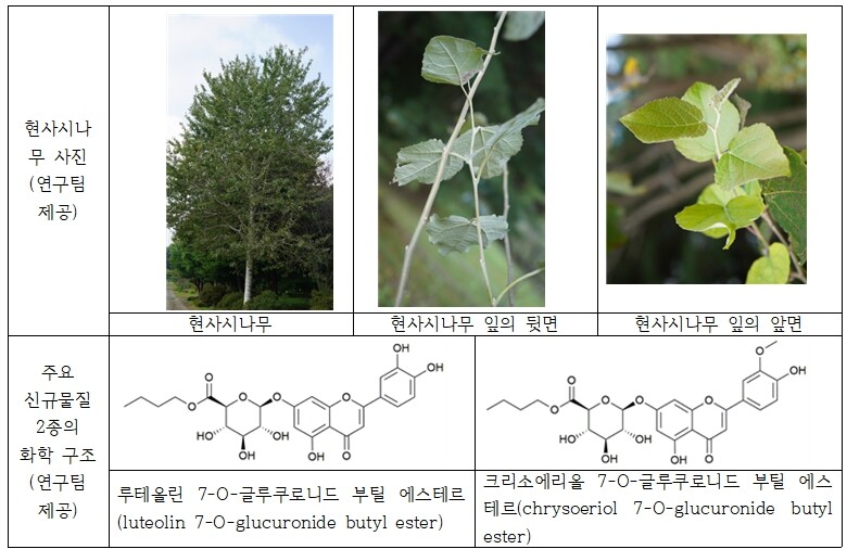 연구팀이 분리한 신규물질은 ‘루테올린 7-O-글루쿠로니드 부틸 에스테르’와 ‘크리소에리올 7-O-글루쿠로니드 부틸 에스테르’, ‘살리신’, ‘살리레포사이드’, ‘포풀린’, ‘써모프소사이드’, 시‘나로사이드’, ‘루틴’, ‘나르신’ 등이다.