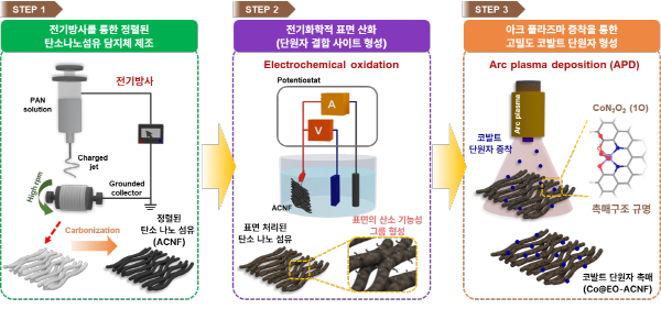 한국과학기술연구원(KIST) 물질구조제어연구센터 김종민 박사, 계산과학연구센터 한상수 박사, 극한소재연구센터 김상훈 박사와 고려대학교 전기전자공학부 주병권 교수 공동연구팀은 화학물질을 사용하지 않는 친환경 건식 기반 아크 플라즈마 증착 공정을 통해 고성능 코발트 단원자 촉매를 제작했다고 30일 밝혔다.