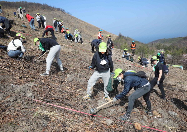 | ▲ 2023년 동해 산불피해지 복원에 동참한 신혼부부 나무심기 참가자들 (사진=유한킴벌리 제공) |