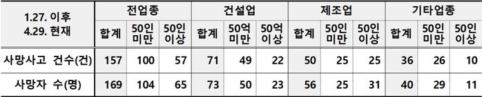 사업장 규모별로는 50인 미만 사업장에서 100건의 사망사고가 발생해 104명이 사망했으며, 50인 이상 사업장에서는 57건의 사망사고가 발생해 65명이 사망했다.