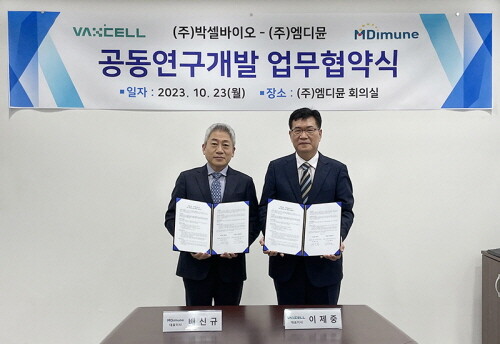 | ▲ 엠디뮨은 지난 23일 박셀바이오와 NK세포 배양공정 공동개발 MOU를 체결했다. (사진=엠디뮨 제공) |