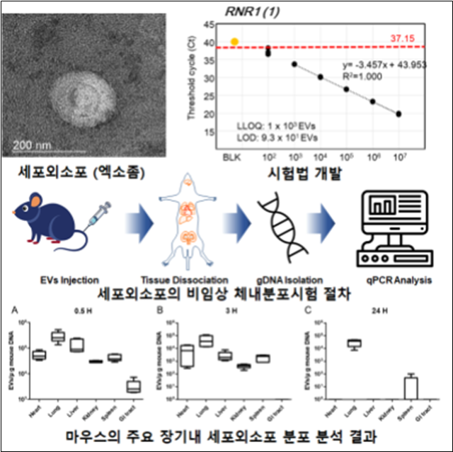 실제 설치류 꼬리 정맥에 투여한 엑소좀 생체 내 분포 평가에서는 투여 후 모든 장기에 걸쳐 광범위하게 분포하는 것을 검증하고, 기존 영상분석과 정량 PCR방법을 비교 분석해 시험법의 타당성을 입증했다.