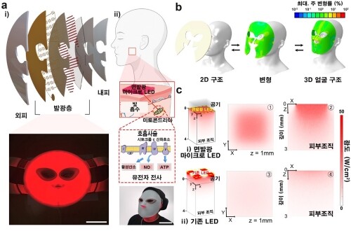 이 교수팀은 유연한 기판에 3차원 종이접기 구조를 적용해 얼굴의 굴곡과 돌출된 부위에 밀착할 수 있는 LED 마스크를 개발했다. 이를 통해 1.5mm 깊이의 진피까지 빛을 균일하게 전달할 수 있으며, 진피 내 미토콘드리아를 자극하고 콜라겐과 탄력 섬유의 합성을 촉진했다.