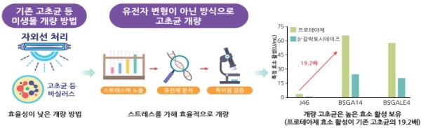 연구팀이 개발한 고초균 BSGA14는 기존 고초균 J46대비 10배 가량 빨라진 발효속도 덕분에 프로테아제와 갈락토시데이즈란 효소의 활성을 각각 19.2배, 15.6배 높이는 것으로 확인됐다. 더불어 연구팀이 이번에 핵심 돌연변이를 원래 미생물에 주입하는 기술 역설계 방식으로 만든 또다른 고초균 BSGALE4도 고초균 BSGA14와 비슷한 효소 활성 증가를 나타냈다.