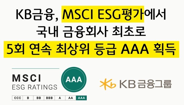 | ▲ KB금융그룹이 모건스탠리캐피털인터내셔널(MSCI, Morgan Stanley Capital International, 이하 MSCI)의 '2026년 MSCI ESG평가'에서 국내 금융회사 최초로 5회 연속 최상위 등급인 'AAA'를 획득했다. (사진= KB금융 제공) |