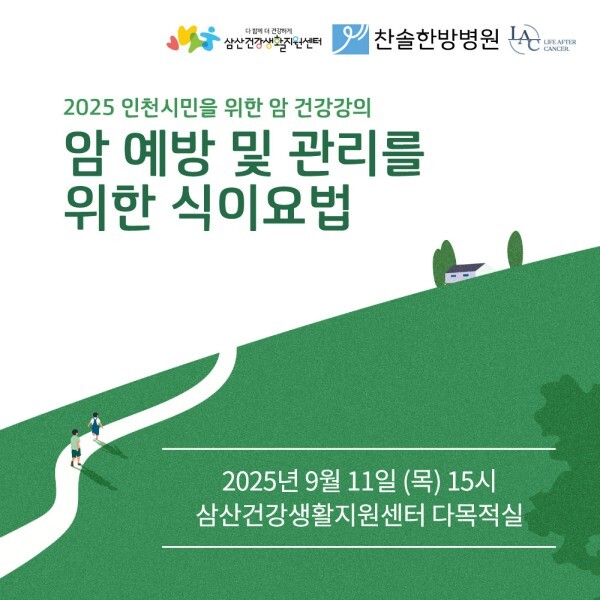 [mdtoday=이가은 기자] 찬솔한방병원이 오는 9월 11일(목) 오후 3시 ‘2025 인천시민을 위한 암 건강강좌’ 개최한다.