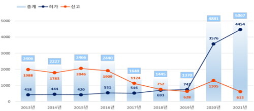 2021년 의약외품 품목허가·신고 5067건 중 심사가 필요한 품목허가 대상 건수는 4454건으로 전년도 3576건 대비 24.6% 증가했고, 심사가 불필요한 품목신고 대상 건수는 613건으로 2020년 1305건 대비 53.0% 감소했다.