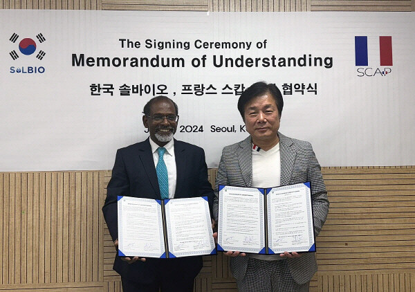 엑소좀 전문기업 솔바이오는 본사에서 반경식 솔바이오 대표와 헤스론 제이콥 SCAP 대표가 참석한 가운데, 한국-프랑스 합작사 '스캅 코리아'를 설립하기 위한 협약식을 가졌다고 18일 발표했다.