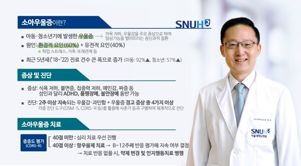 우울증은 우울감과 의욕 저하를 주요 증상으로 가지며 다양한 인지·정신·신체적 증상을 동반하고, 일상기능을 떨어뜨리는 정신과적 질환이다. 이런 질환이 아동·청소년에게 발생하면 소아우울증이라고 한다. 소아우울증의 원인은 학업 스트레스, 가족·또래관계 등 60%를 환경적 요인이 차지하며, 나머지 40%는 유전적 요인이다.