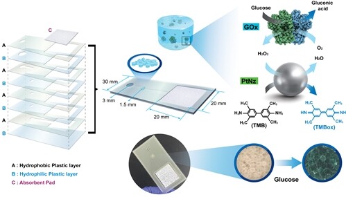 | ▲ 적층 구조의 플라스틱 디바이스와 백금-고분자 복합소재를 활용한 당 검출 효소기질 촉매반응 (사진=한국기초과학지원연구원 제공) |