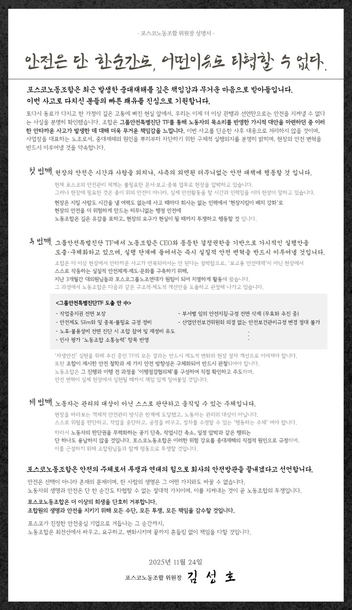 포스코 노동조합은 24일 발표한 성명서를 통해 "최근 발생한 중대재해를 깊은 책임감과 무거운 마음으로 받아들이며, 이러한 비극이 다시는 반복되어서는 안 된다"고 밝혔다.