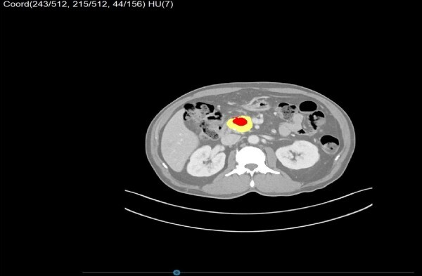 | ▲ CT 데이터를 기반으로 병변(붉은색)과 주요 장기(노란색)를 AI가 자동 구분한 3D 영상 (사진=엠에스병원 제공) |