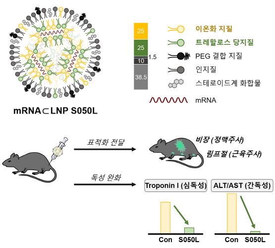 지질 나노입자 내 트레할로스 당지질의 함량을 조절한 결과, 전체 지질 중 이온화 지질의 함량을 기존 50%에서 25%로 줄이고 트레할로스 당지질을 25% 추가한 새로운 지질 나노입자 조성 방법을 개발했다.