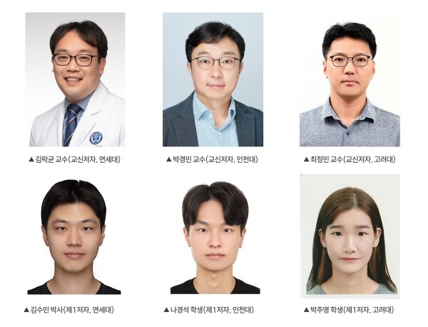 | ▲ (왼쪽부터 시계방향) 연세대 김락균 교수, 인천대 박경민 교수, 고려대 최정민 교수, 연세대 김수민 박사, 인천대 나경석 학생, 고려대 박주영 학생 (사진= 강남세브란스병원 제공) |