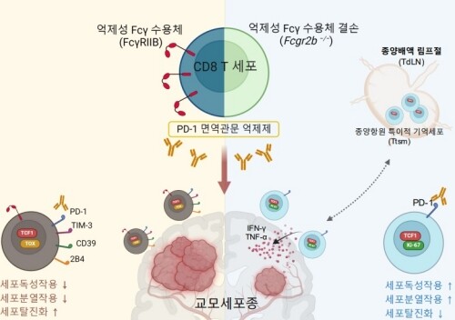 연구팀은 최근 세포독성 T세포에서 발견된 억제 수용체(FcγRIIB)가 종양 침윤 세포독성 T세포의 특성과 면역관문억제제(항 PD-1)의 치료 효능에 미치는 영향을 확인했다.