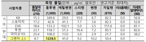 지난해 실내 공기질 조사 결과, 현대 그랜저에서 8가지 유해물질 중 하나인 톨루엔의 권고기준을 초과한 것으로 드러났다.