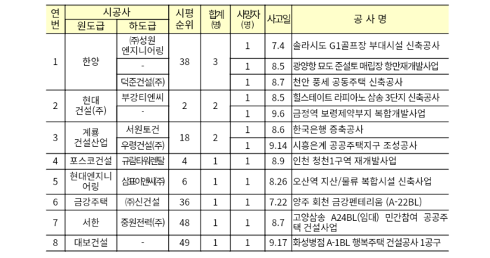 이어 ‘현대건설’과 ‘계룡건설산업’에서 각 2명, ‘포스코건설’, ‘현대엔지니어링’, ‘금강주택’, ‘서한’, ‘대보건설’ 등 5개 건설사에서 각 1명의 사망자가 발생했다.