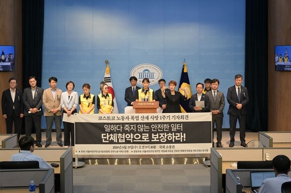 마트산업노동조합는 코스트코 하남점에서 폭염 산재사망 사고가 발생한지 1년이 된 지난 19일 민주노총 서비스연맹, 더불어민주당 을지로위원회 주최 국회 소통관 기자회견에서 여전히 바뀌지 않는 코스트코의 노동환경 실태를 고발하고 대책마련을 요구했다.